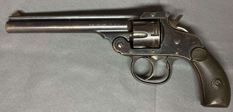 Harrington & Richardson Arms Co. revolver chambered for .22 Rimfire. Features a break-top design, 6-shot cylinder, and black checkered grip. Serial number 81160 marked on the grip base. Manufactured in Worcester, Mass., USA.