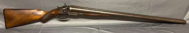 L.C. Smith double barrel shotgun with 30” Damascus steel barrels. Features external hammers, checkered grip, and visible stock damage near the trigger area. Manufacturer markings visible on barrels and frame, serial #18549 inscribed.