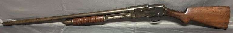 J. Stevens Arms & Tool Co. 520 pump-action shotgun featuring a 27” barrel, engraved receiver markings, and a grooved wooden forearm. Serial number 40277 visible.
