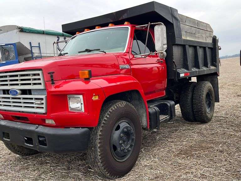 LOT 3320 - 1986 Ford F700, Dump Truck runs, VIN 1FDNF70H8GVA28883, has title, A $25 TITLE FEE WILL BE ADDED TO THE WINNING INVOICE