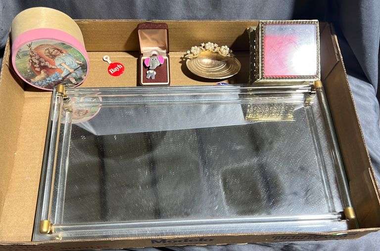 Mirrored Vanity Tray 16”x9” “ Jewelry Box 3.5” • Nested Wood Boxes 5” • Elephant Pin • misc