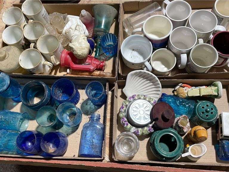 Mug assortment including Norman Rockwell mugs, daisy and button vases 2.5" tall, blue glass assortment, misc