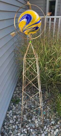 1000 | Metal Garden Orb with Yellow and Blue Glass Sphere, 57” x 12” x 12”