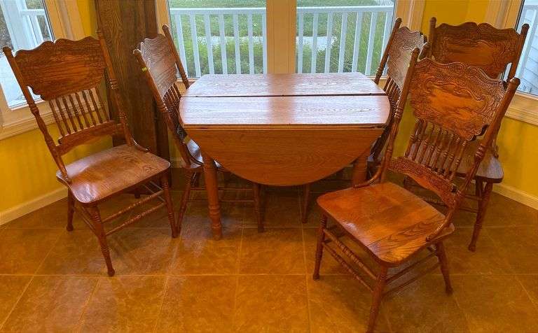 Oak drop-leaf dining table (42”x51”x29”) with three 11”W leaves. Includes five matching oak chairs (18” floor to seat) featuring intricately carved backs and spindles.