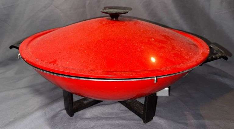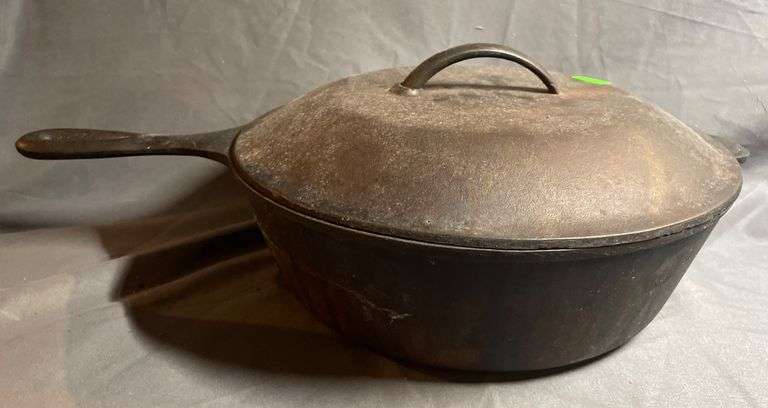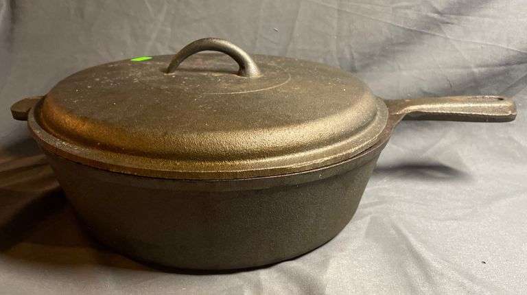 Round cast iron skillet with lid, featuring dual handles for easy handling. Includes a matching lid with a central handle. Visible surface wear indicative of prior use.