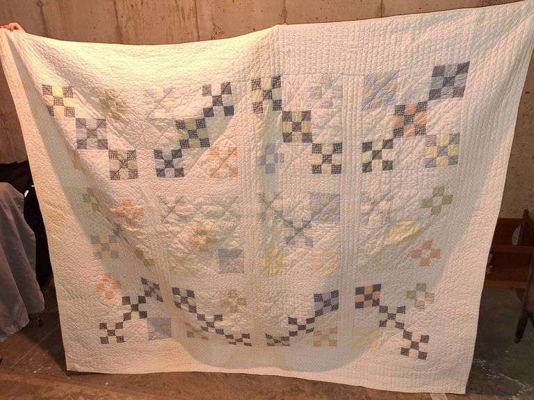 Patchwork quilt featuring a twelve-patch geometric design in soft pastel tones and patterned fabrics on a white background. Hand-quilted details include linear and square motifs. Reverse side is plain white with quilted stitching.