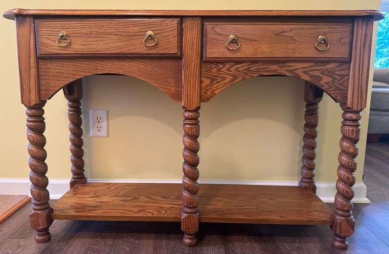 123 | Solid Oak Console Table with Spiraled Legs, 2 Drawers and Ring Pulls, 44” x 16” x 29”