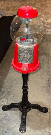 Red gumball machine with glass globe on a 39” black cast-iron base. Includes coin slot and dispensing mechanism. Moderate wear from use.